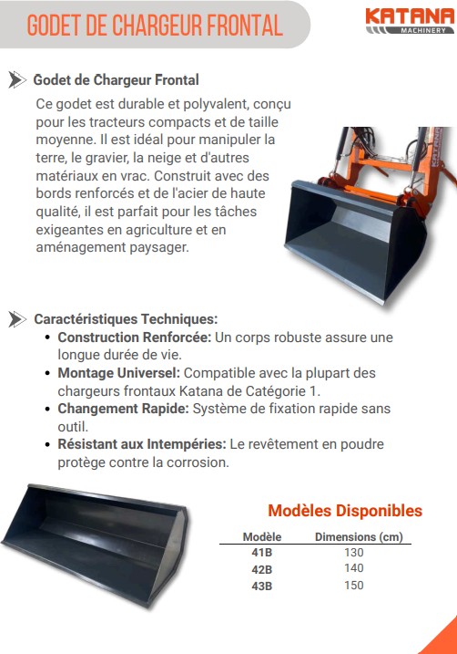 Ce godet est durable et polyvalent, conçu pour les tracteurs compacts et de taille moyenne. Il est idéal pour manipuler la terre, le gravier, la neige et d'autres matériaux en vrac. Construit avec des bords renforcés et de l'acier de haute qualité, il est parfait pour les tâches exigeantes en agriculture et en aménagement paysager.