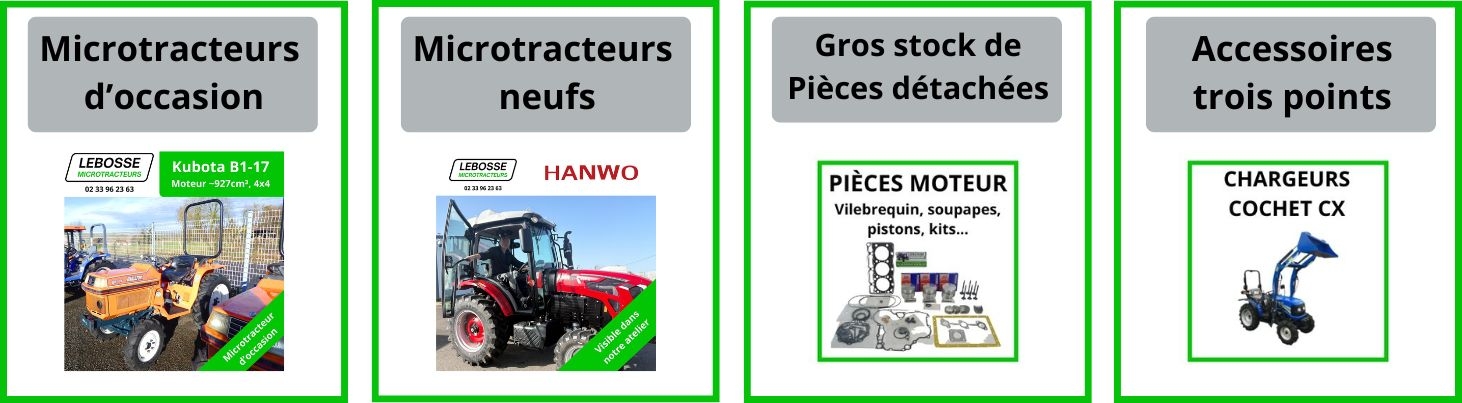 L'entreprise Lebossé Microtracteurs a été créé en avril 2002. Les ateliers, tout d'abord située à Tinchebray, déménagent ensuite à Athis Val de Rouvre, près de Flers, en Normandie. Situés à 1h de Caen, nous proposons à tous les professionnels et les particuliers de Normandie, Sarthe, Mayenne et autres régions proches, une offre complète en matière de microtracteurs d'occasion, entièrement révisés par nos mécaniciens dans nos ateliers. Nous proposons également des microtracteurs neufs homologués route de la marque Hanwo. Les pièces détachées d'occasion que nous récupérons dans notre atelier sont soigneusement nettoyées et contrôlées avant expédition. Quand aux pièces détachées neuves, elles sont certifiées d'origine ou compatibles.
